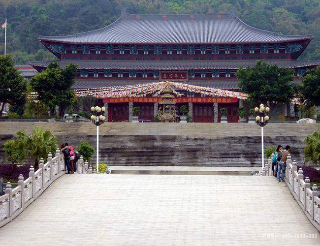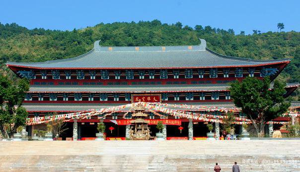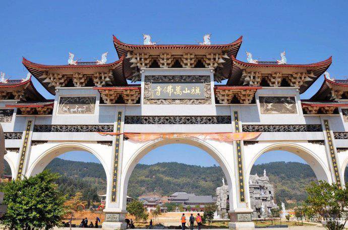 旗山是福州西郊的一座名山,与鼓山东西相对,享有"左旗右鼓,八闽二绝"的盛誉。旗山因山势逶迤似翠旗招展而得名,西北原有宋建"石松寺",惜因年代久远,寺殿己陈旧失修。近十年,世纪金源集团董事局主席黄如论先生捐資三亿元在旗山脚下源"石松寺"而建当今"万佛寺"。万佛寺塔陵座北朝南,324国道从大门前经过,占地一千三百多亩,号称东南亚第一大佛教圣地。現己建成天王殿丶大雄宝殿丶钟楼丶鼓楼丶般若堂丶地藏殿等主体建筑。傍324国道的大门口"翠旗名山"石制大牌坊气势磅礴壮观辉煌。步入牌坊,两旁是新开发的仿古商业街,道路两边人物雕像维妙维肖。  "旗山万佛寺"的石牌坊同样高大壮覌,纵观各大寺庙这样巨大的牌坊还真不多見,给人一种该寺气势宏伟先入为主的感覚。从牌坊门洞往北望去,百米之外的殿台楼宇分布在山脚,而门口到大殿之间仍是一片待开发的宽广荒地,进寺只能从左边便道上去。  万佛寺大牌坊左侧三尊覌音菩萨石刻巨大立像面西摆放,殿前花圃两边同样摆放着十几二十尊覌音石雕像,或坐或臥神态不一,天王殿两侧是钟豉楼。天王殿门中上掛"皆大欢喜"匾,笑佛两旁是高大的四大金刚,也是民间喻意的"风调雨顺"之神,怒目呲牙,让人望而生畏。  弥勒佛背面是护寺之神韦驮。出天王殿,是宽大的石桥,桥下是放生池,浑浊的水中只见大小不一的乌龟或游弋或懒洋洋地晒太阳。放生池左右两旁的建筑物有的己请进神像有的还空空如也,大雄宝殿轟立眼前,大雄宝殿各角和巨大的铜香炉之间拉起的五颜六色彩旗,仿佛该寺还沉浸在节日中。