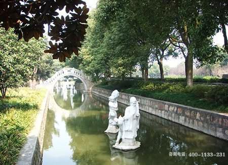 通向华侨墓区的大道,首先印入眼帘的是一座104米长的拱型大桥,名为“至归桥”,桥上刻有栩栩如生的蝙蝠及莲花,寓意为“福如东海、寿比南山”。墓园总占地200余亩,墓区分福、禄、寿、禧四个大区,由南向北排列,布局合理,每区有一座不锈钢雕塑标志,其图形分别是:“老树荫福”、“快鹿灵芝”、“松鹤长寿”、“喜鹊登梅”。购墓者可任意挑选区域,任意选购墓穴面积大小和设计造墓式样。
