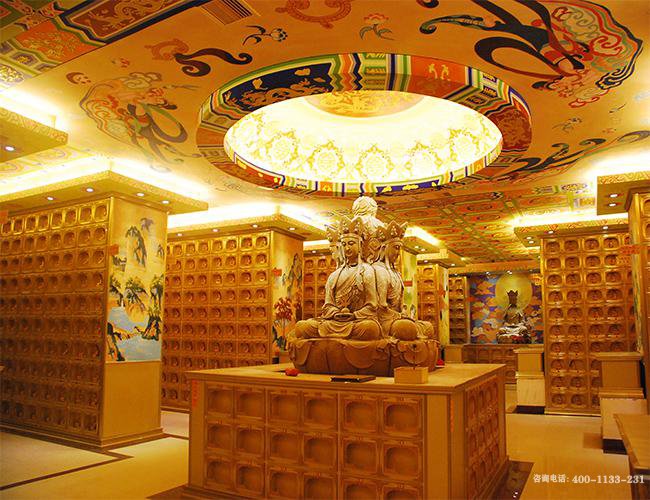 灵泉寺普同堂位置地址坐落在千年观音到场灵泉寺的下庙,与历代高僧大德灵骨舍利塔相临,面朝涪江水,背靠灵泉山。整个地形犹如太师椅一样将普同堂环抱,峨嵋山风水大师源明法师评价说:“这是西南地区罕见的风水宝地。”灵泉寺普同堂外观宏伟壮观,古朴厚重,内装饰金碧辉煌,高贵典雅。分为地宫和祭拜大厅两部分,主要用于信众、游客供奉观音佛像许愿祈福。堂内总共有上万尊镀金观音佛像,设计师借用现代科技手段让每尊佛像笼罩在佛光普照之中,显得分外富丽祥和,所以又叫万佛宝殿。同时每尊佛像背后设置了一个福位,可永久存放僧人、皈依弟子和信众百年之后的灵骨、牌位,让后人永远怀念和追思。这样的设计理念不仅是对观音文化和孝道文化的完美融合,更是让众生百年之后达到与佛同在的极致境界!灵泉寺普同堂还是西南地区档次最高、设计最科学、售后服务最完善的室内灵位存放大殿,其中上万尊镀金佛像和近五米高的金身阿弥陀佛像在国内也是罕见的。