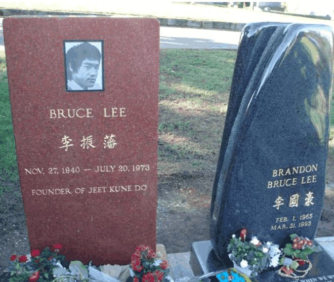 最后我们要说一下,西雅图李小龙墓地的旁边,就是他的儿子李国豪的墓地,李国豪也是在拍摄一部电影的时候突然死亡的,年仅28岁。李小龙的墓碑是绛红色的,金字;李国豪的墓碑是黑色的,金字。