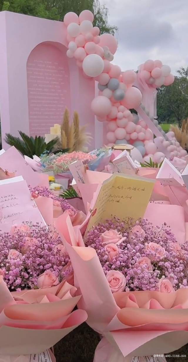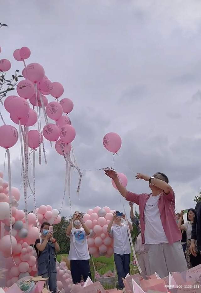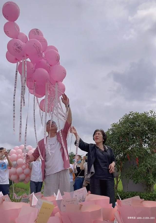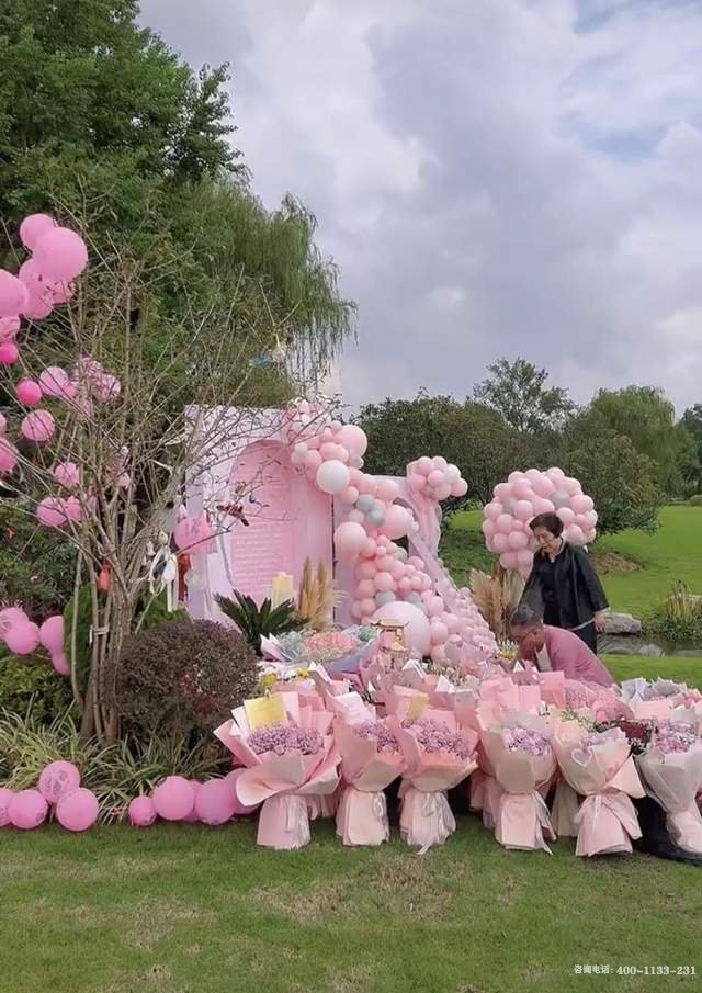 父母在儿子的墓地前,摆满粉色鲜花与气球,打造了一个极其温馨浪漫如城堡般的场景,以此来寄托他们的哀思。