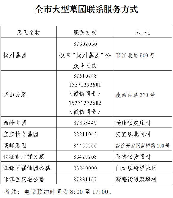 二、实行预约祭扫。确需现场祭扫的需提前预约,无预约的不得现场祭扫。市民可通过“扬州民政”微信公众号网络预约或电话预约市属墓园祭扫,或通过各地公布的殡葬服务机构电话预约县(市、区)墓园现场祭扫,预约需按要求填报相关信息,实行限量预约、约满为止。请市外人员主动关注我市对市外旅居史人员的健康管理要求,在健康监测期间不得进入墓园祭扫。