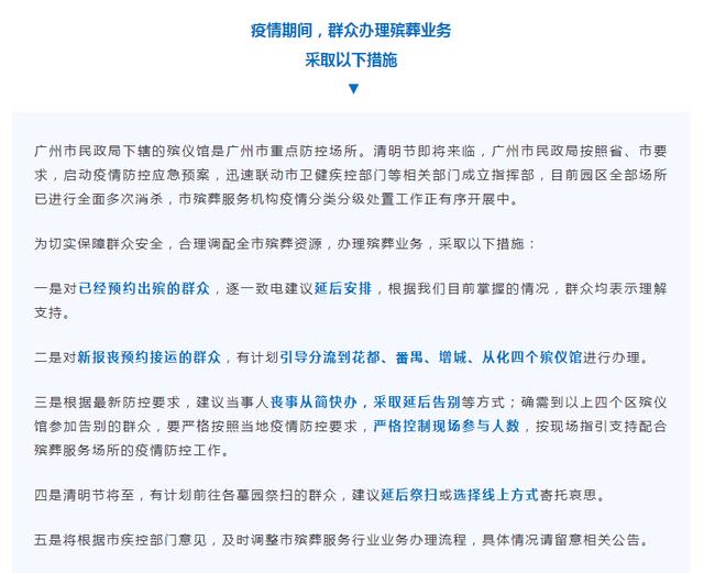 佛山市民政局相关负责人同时提醒广大市民,由于当前佛山仍然处于疫情防控状态,因此佛山市各大殡葬服务单位将根据市疫情防控指挥部命令,按照佛山实际疫情情况进行防控措施动态调整,一旦出现疫情防控等级上调情况,相关区域的殡葬服务单位将根据要求立即停止祭扫服务提供,并按照规定疏导人群,请各位市民提前知悉和支持、配合。