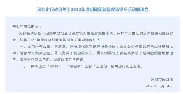 3月14日,深圳市民政局发布通知:为避免清明期间因集中祭扫活动引发输入性和聚集性疫情,保护广大群众的身体健康和生命安全,深圳所有公墓、骨灰堂、深埋绿化地等殡葬服务场所,14日起暂停市民群众现场祭扫活动;暂停举办集体公祭、骨灰海葬(代撒除外)、骨灰树葬等人群聚集活动;延期缴纳墓地管理费、骨灰寄存费等费用。恢复时间另行通知。