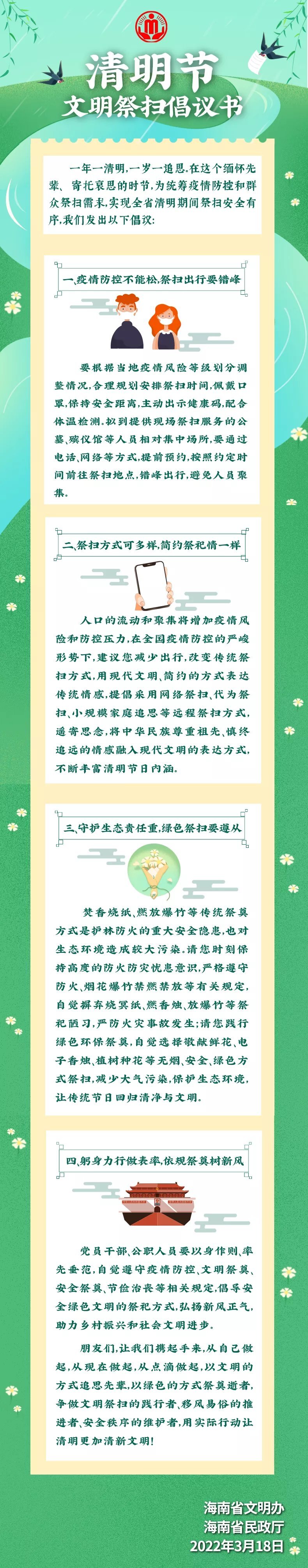 商报全媒体讯(椰网/海拔手机端记者 许文玉 )清明节将至,在这个缅怀先辈、寄托哀思的时节,为统筹疫情防控和群众祭扫需求,实现全省清明期间祭扫安全有序,3月18日,海南省文明办及海南省民政厅联合发布清明节文明祭扫倡议书。