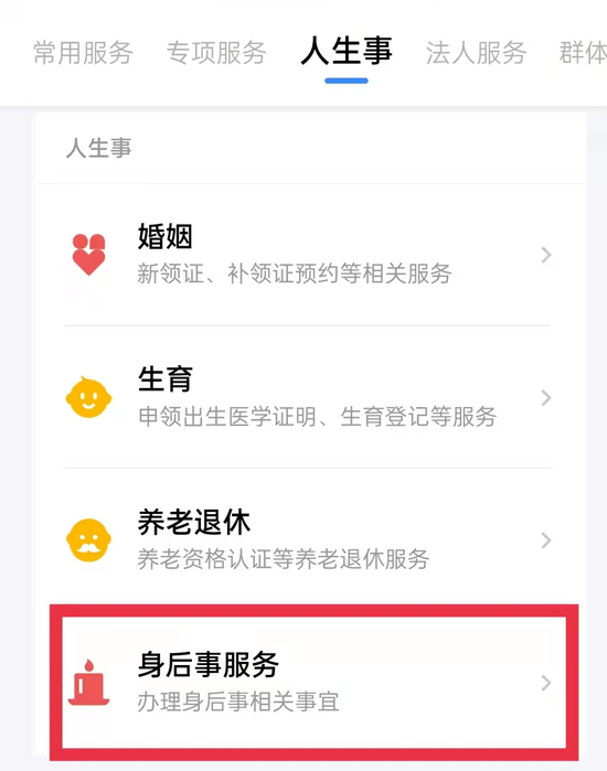 第三步:点击“人生事”,再找到并点击“身后事服务”;