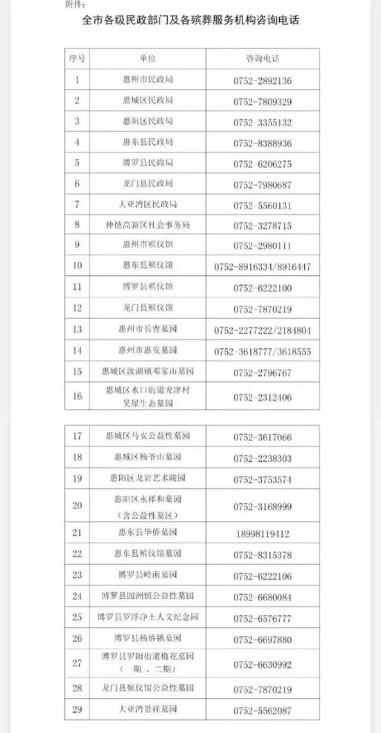 《公告》要求,从3月23日起,惠州市范围内殡仪馆、公墓、骨灰楼(堂)等殡葬服务机构暂停现场祭扫活动,暂停举办集体公祭、骨灰海葬、树葬等人群聚集的祭扫活动。