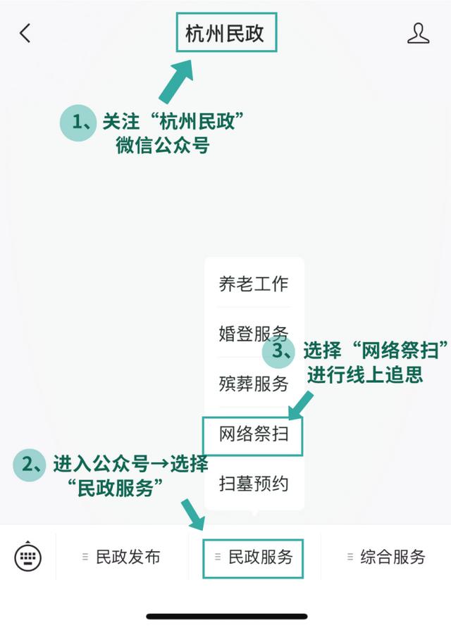 “杭州民政”微信公众号以及南山陵园、钱江陵园、华侨陵园、半山公墓、安贤陵园、第二公墓、第三公墓、余杭闲林公墓、临平公墓的微信公众号内均已开通网络祭扫的功能。