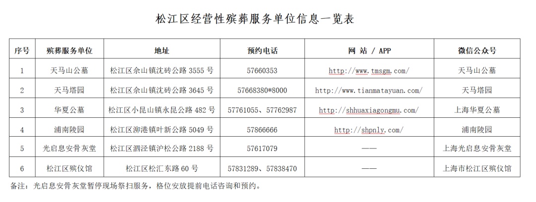3月26、27日以及4月2、3、4、5日6天,松江现有的4家经营性公墓和1家经营性骨灰堂将迎来祭扫高峰。经与区民政局对接了解,以下入园须知请广大市民注意: