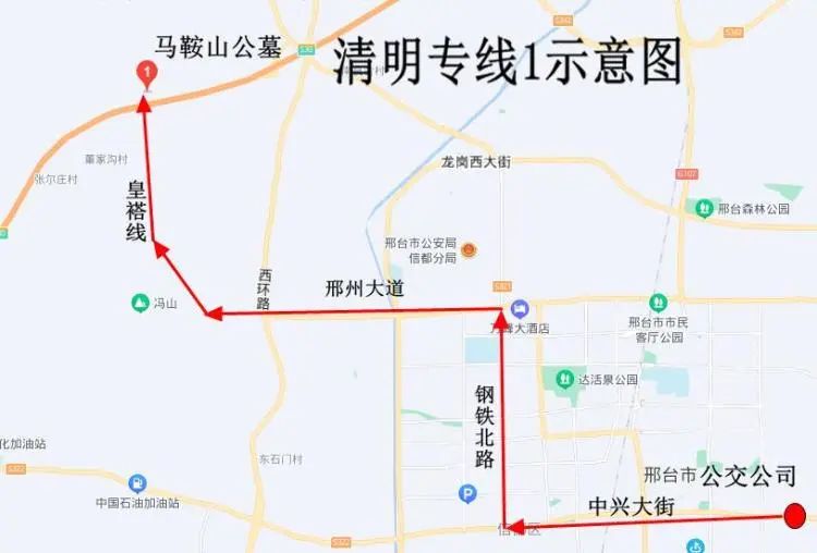 线路走向:从公交公司门口发车,途径中兴大街、钢铁北路、邢州大道、皇褡线至马鞍山公园。