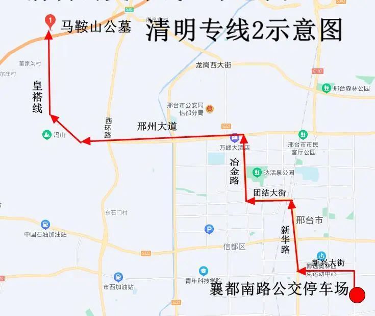 线路走向:襄都南路停车场出发,途径襄都路、新兴大街、新华路、团结大街、冶金路、邢州大道、皇褡线至马鞍山公园。