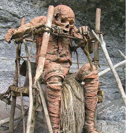 接下来,为防止空气进入让尸身腐朽,会将死者的眼睛,嘴巴和肛门缝起来。听说,这一过程是确保尸身无缺保存长达数个世纪的关键所在。制造者会将死者的脚掌,舌头和手掌砍下来交给尚存的爱人,留作留念,而最终留下来的尸身才放在火坑上熏烤。