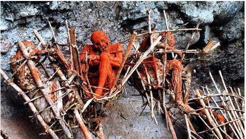 数世纪以来,在巴布亚新几内亚的安加部落(the Anga tribe)都传承着独特的殡葬典礼。他们并不会将死去的人葬入墓地中,而是经烟熏后制成干尸,并悬挂在陡峭的岩壁上,让它们俯瞰村落。尽管一长串干瘦,红彤彤的尸身挂在山上令人感到毛骨悚然,但对安加部落来说,这却是对死者最高的敬意。
