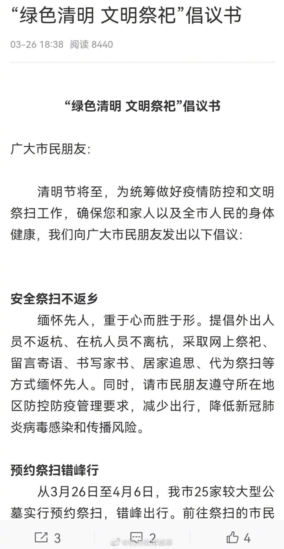 【#杭州发出文明祭祀倡议书# [话筒]】3月26日,杭州发出“绿色清明 文明祭祀”倡议书,倡议大家安全祭扫不返乡、预约祭扫错峰行等,具体如下——