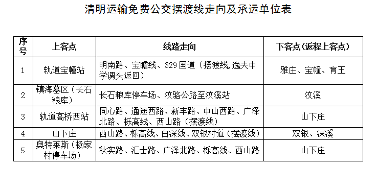 今年清明小长假为4月3日至5日,预测三天客流总量约15万人次,其中4月5日(清明节)为客流高峰。为此,我市将调整轨道交通运行时间,同时开通5条免费公交摆渡线:东片开通轨道宝幢站往返育王、宝幢、雅庄等墓区的免费公交摆渡线;西片开通轨道高桥西站往返山下庄、奥特莱斯(杨家村礼堂)往返山下庄、以及山下庄往返双银、深溪墓区的免费摆渡线;北片开通镇海长石粮库往返汶溪的免费摆渡线。