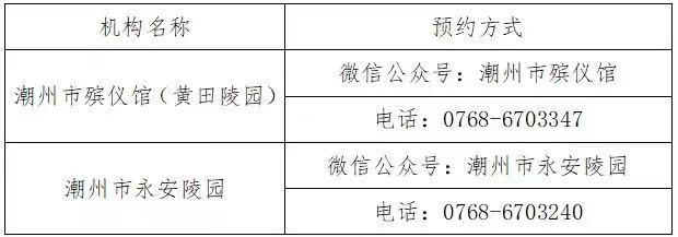二、自通告发布之日起至4月10日止,凡需现场祭扫的群众,要提前两天向祭扫场所所在的殡葬服务机构提出预约,各殡葬服务机构要按照当日实际承载能力的50%以内控制预约人数,实行分时分段祭扫。每天7:30—17:30共设置10个时段,每个时段为1小时。请广大市民科学合理安排祭扫时间,提前预约,错峰祭扫,减少人员聚集。其中:潮州市殡仪馆、潮州市永安陵园可通过微信公众号及公布电话进行预约,各镇(场)联系电话(附后);各镇(场)祭扫场所按属地管理原则,落实落细疫情防控及便民服务措施,逐个场所指定专人负责,确保现场祭扫安全、平稳、有序。