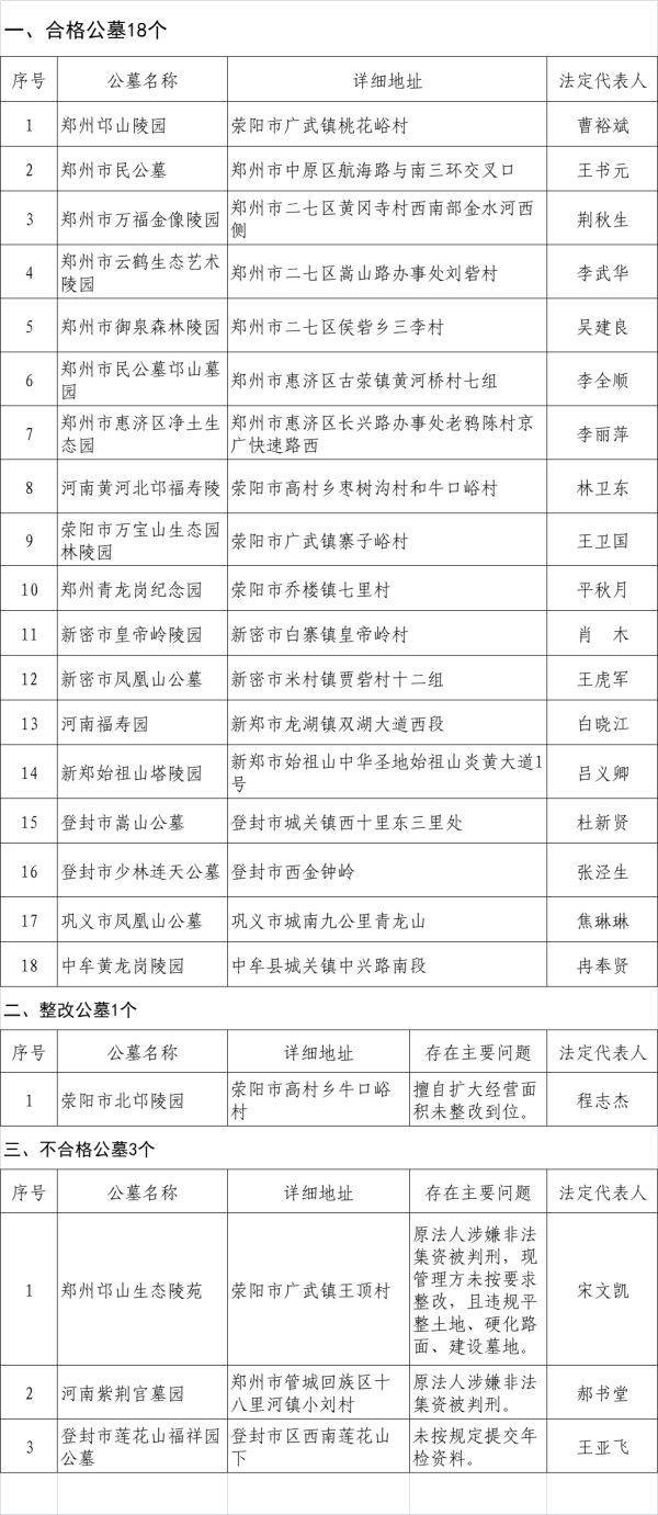合格公墓为:郑州市邙山陵园、郑州市民公墓、郑州市万福金像陵园、郑州市云鹤生态艺术陵园、郑州市御泉森林陵园、郑州市民公墓邙山墓园、郑州市惠济区净土生态园、河南黄河北邙福寿陵、荥阳市万宝山生态园林陵园、郑州青龙岗纪念园、新密市皇帝岭陵园、新密市凤凰山公墓、河南福寿园、新郑始祖山塔陵园、登封市嵩山公墓、登封市少林连天公墓、巩义市凤凰山公墓、中牟黄龙岗陵园。