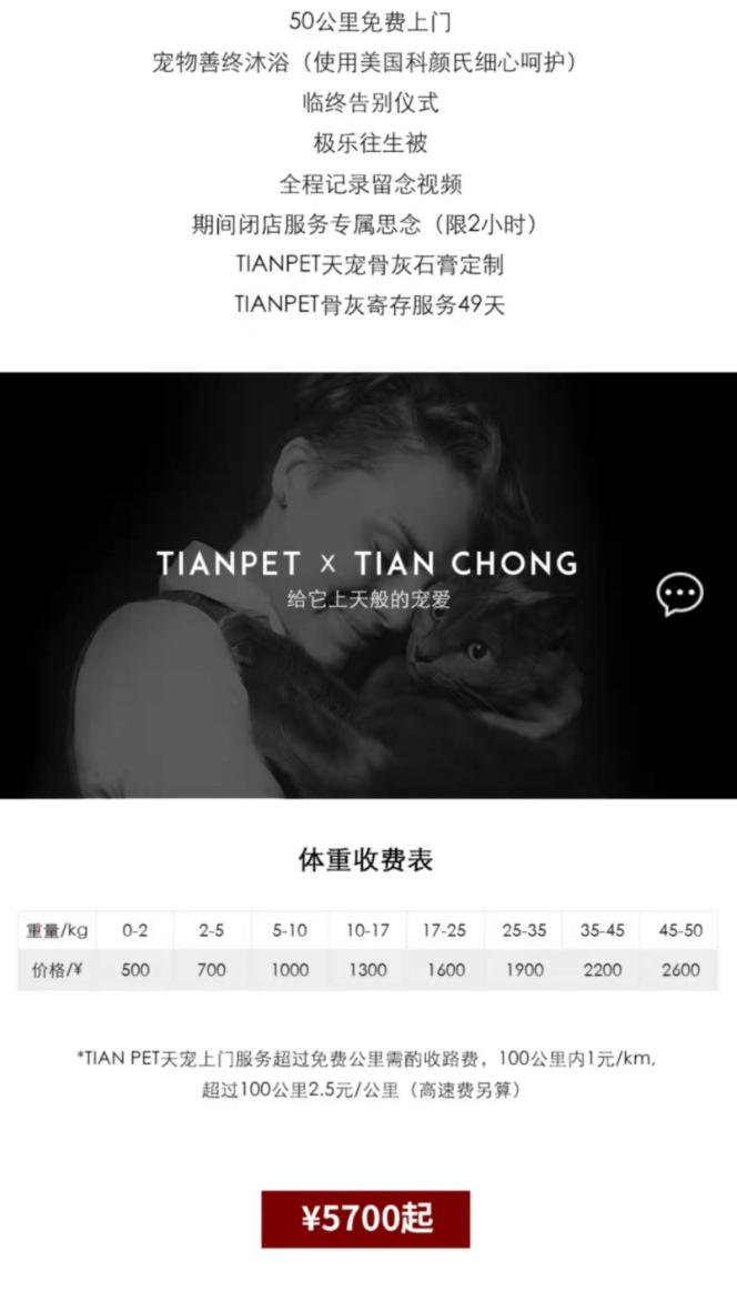 天宠的收费标准是方案加体重结合收费,目前共四套方案,最贵的“天宠方案”是5700元起,方案中包括专车接送、科颜氏善终沐浴、定制骨灰石膏等服务和产品。
