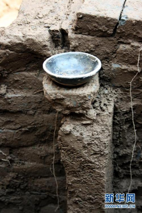 4月3日,河北献县职教中心在建工地发现的唐代古墓墓室东壁上的黑釉灯盏,它在这里一千多年来没有变动位置。