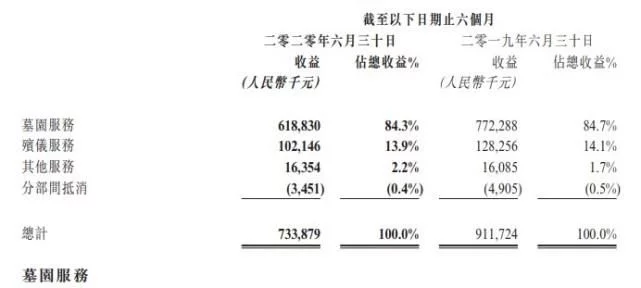按照财务数据来看,福寿园的主营业务墓园服务和殡仪服务均出现一定的下滑情况。其中,墓园服务收益6.19亿元,同比减少19.9%;殡仪服务中,殡仪服务收益为1.02亿元,同比减少20.4%。